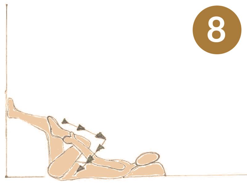 Con entrambe le gambe in posizione 1, metti le mani all’interno e all’esterno della radice della coscia destra e fai 3 pompaggi (ovvero, con il palmo della mani fai delle pressioni verso l’interno poi tira verso la radice della coscia e rilascia).